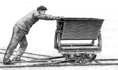 Before the coming of the railway, these galets were gathered on the coast-line by ramasseurs, often women, who filled up baskets about 60cm/2’ in diameter. They were then loaded into rafts for transport onwards. The galets were crushed and used as building sand, aggregate, as abrasives and a component of the local faïence/pottery. Raft journeys were laborious and hazardous and so by the 1880s, temporary Decauville tracks were laid to aid in the harvest. Tipper wagons took these to the port, canal or station. The picture below shows ramasseurs and, in the background, a 60cm line. Below is shown a maker’s illustration of the standard tipper wagon. Tremendous muscle power must have been needed to lift a laden basket but at least it wasn’t necessary to stagger all the way to town.